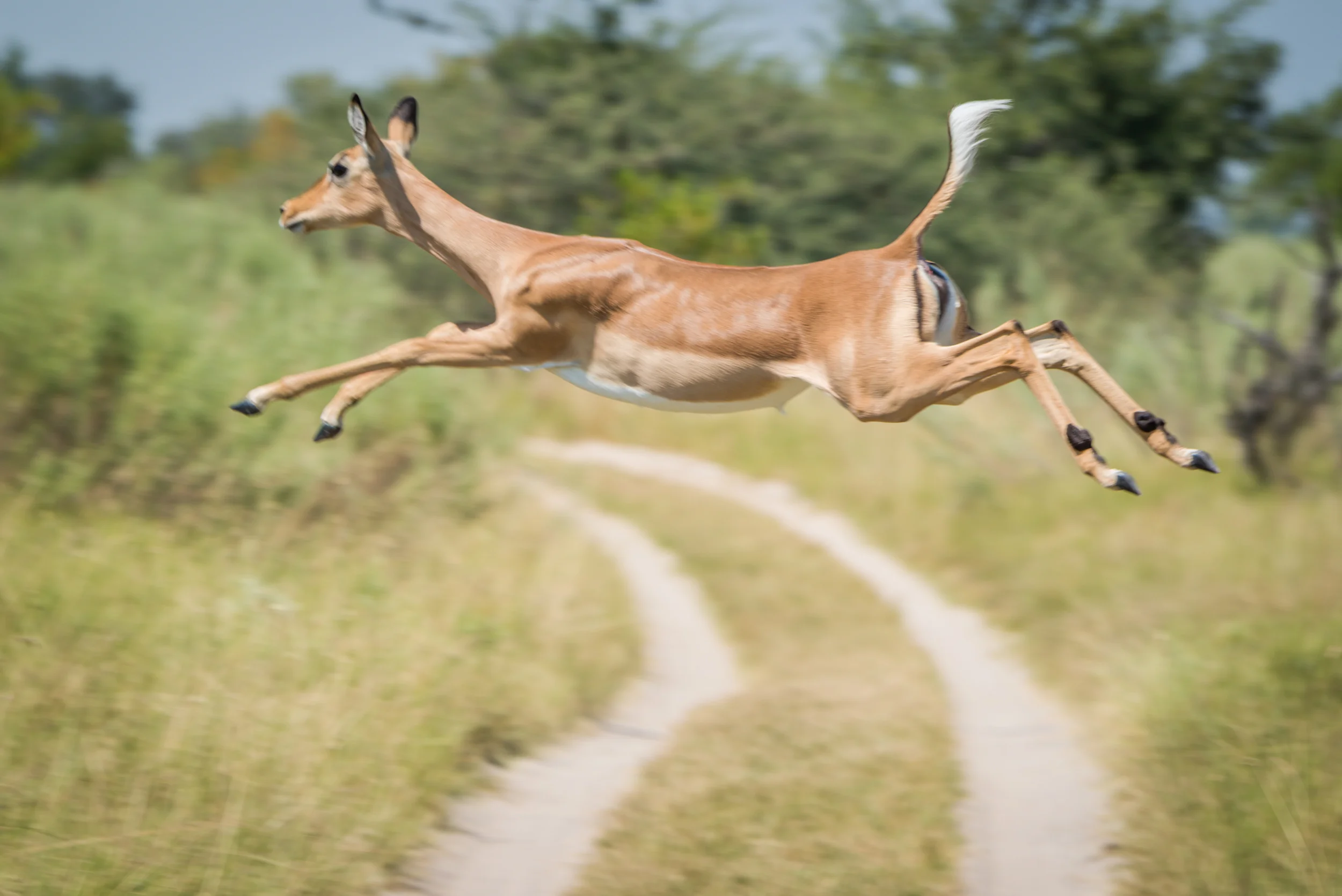 I was parked in a jeep in Botswana when a herd of impala came chasing across the road. They were galloping fast, but there were five or six of them, so I did have time to focus on each of them, one by one, as they crossed the road in turn.